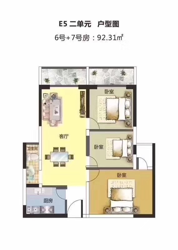 三房?jī)蓮d兩陽(yáng)臺(tái)92 ㎡